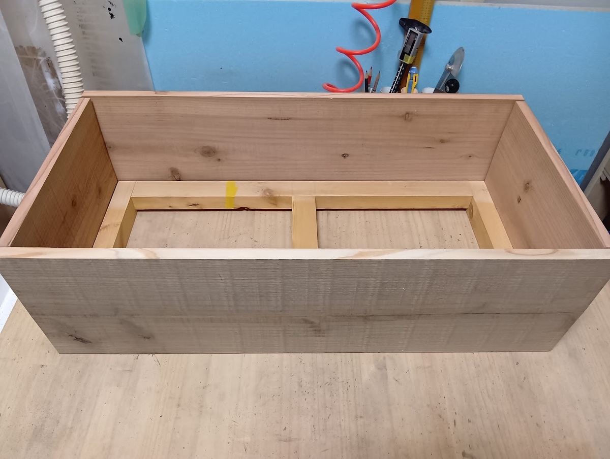 当初は、側板の内側に角材を支柱としていましたが、土台部分に